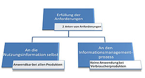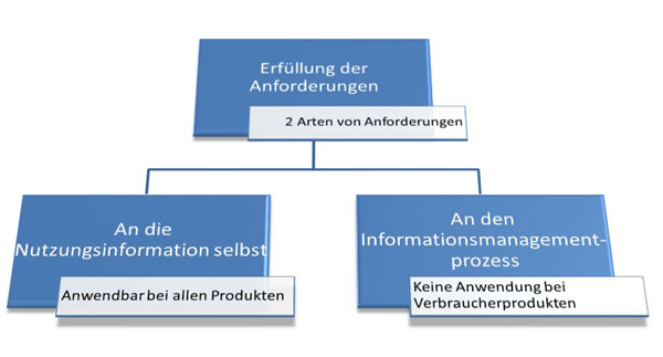 Die IEC/IEEE 82079-1 unterscheidet zwischen Anforderungen an die Nutzungsinformationen selbst, wie z.B. deren Inhalt, Struktur, Medien und Format, und Anforderungen an den Informationsmanagementprozess. Für die Erfüllung der Anforderungen der IEC/IEEE 82079-1 ist bei Verbraucherprodukten einzig relevant, ob die Nutzungsinformationen die Anforderungen füllen. Bei allen anderen Produkten kann man sich entweder dafür entscheiden, die Anforderungen an den Informationsmanagementprozess zu erfüllen oder die Anforderungen an die Nutzungsinformation selbst oder auch beides.