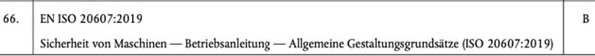 Nun drängt sich eine weitere Norm aus der Ecke von ISO in den Vordergrund. Wie bereits mehrfach berichtet, gibt es seit dem Frühjahr 2019 die ISO 20607 für Betriebsanleitungen für Maschinen. Eine Norm, welche sich selbst im Regelungsumfang auf die "sicherheitsrelevanten Teile" einer Betriebsanleitung reduziert.