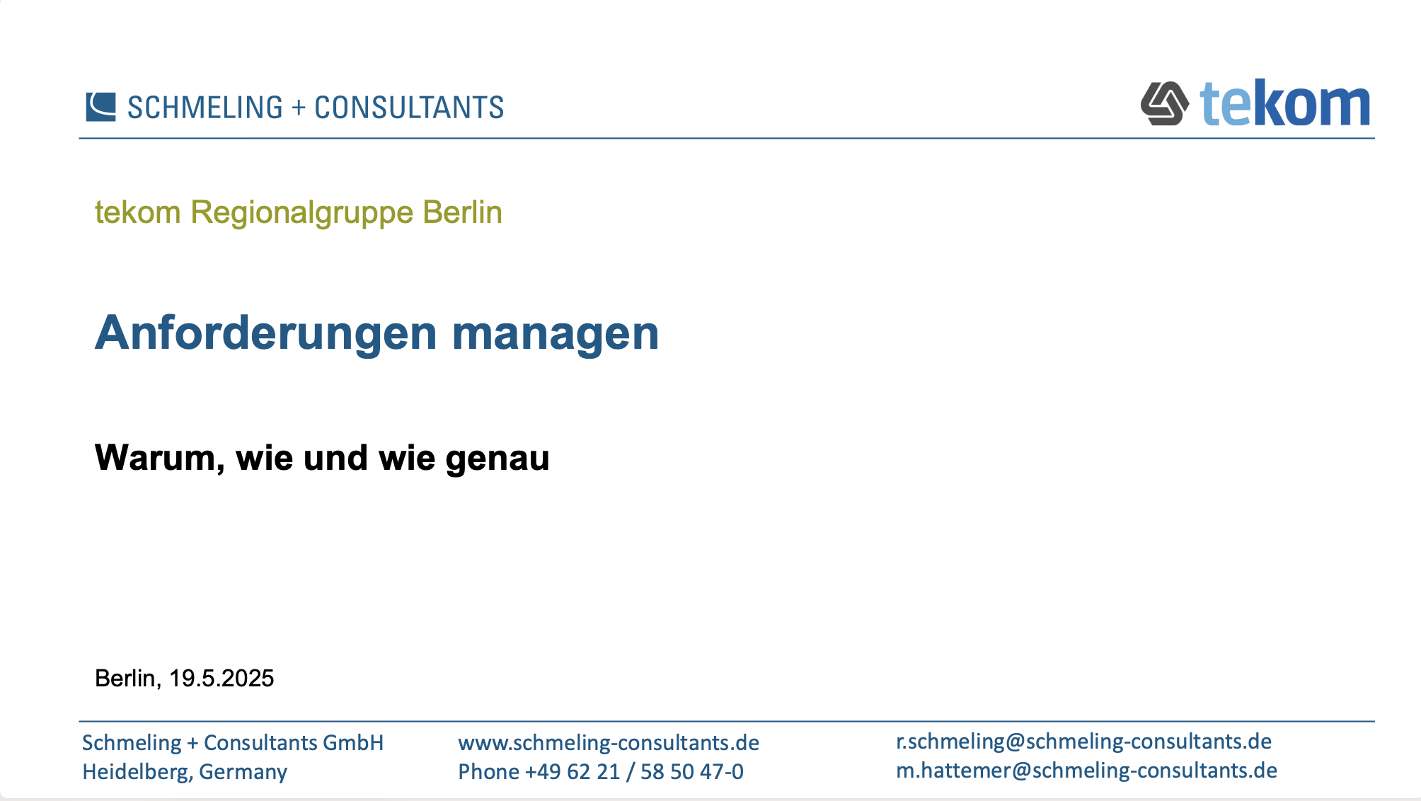 Gelernt wurde: Zusammenhänge und Maßnahmen für anforderungsgerechte Nutzungsinformationen, dauerhaft und global. Grundlagen des Anforderungsmanagements an konkreten Beispielen. Nutzen und Umsetzungsmöglichkeiten.