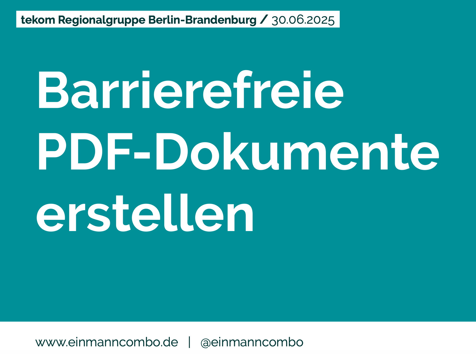 Zum Referenten: Klaas Posselt hat Druck- und Medientechniker studiert und ist über verschiedene Anfragen zum Thema barrierefreie PDF-Dokumente zum Thema gekommen. Als Selbständiger unter dem Label einmanncombo schult er Kunden und begleitet sie bei der Einführung, Umsetzung und Optimierung von Publikationsprozessen. Als Co-Chair der PDF/UA Technical Working Group (TWG) der PDF Association engagiert er sich für die Weiterentwicklung und Verbreitung des PDF/UA-Standards, der für barrierefreie Dokumente steht.
