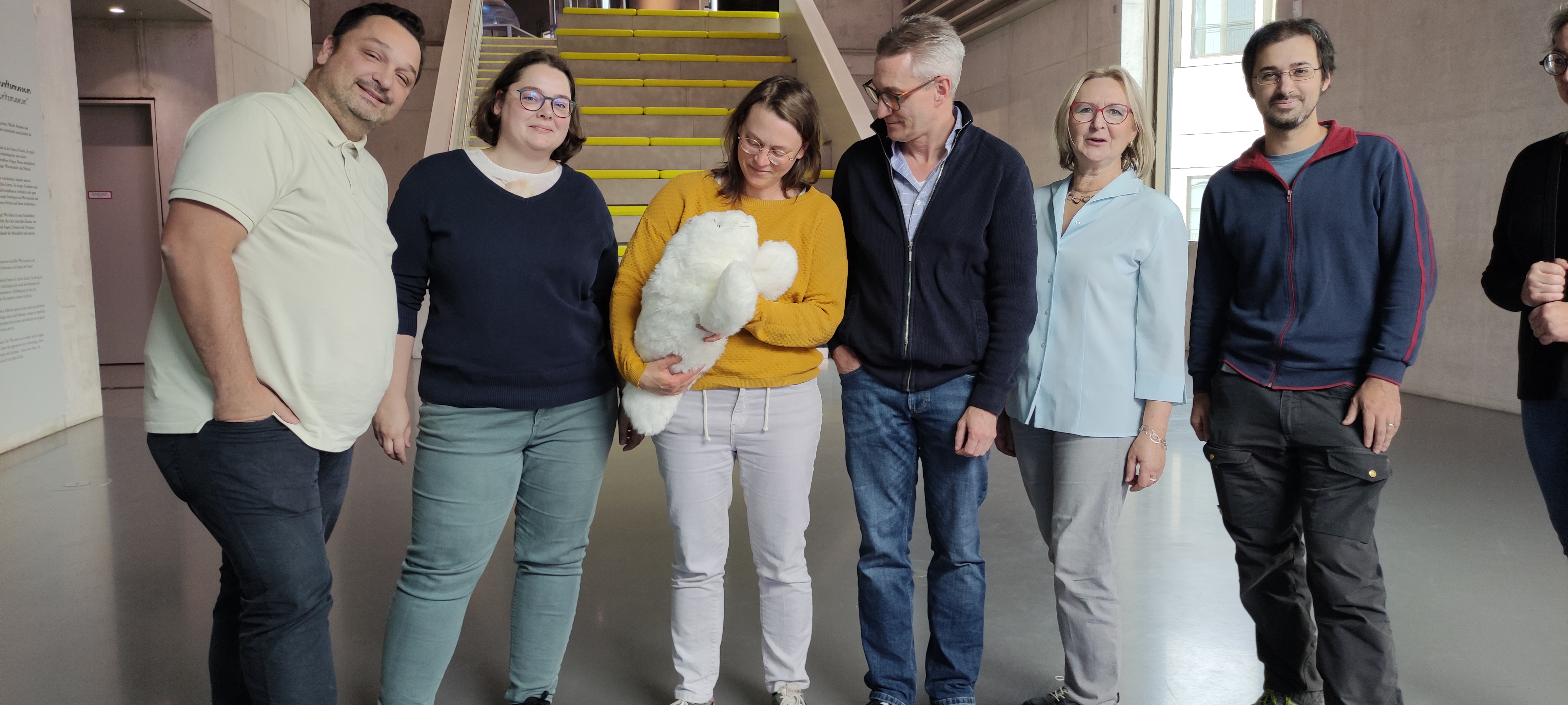 Die Fotos zeigen unseren Guide Rolf mit Roboter Robbe Paro und einige der Tour-Teilnehmer.