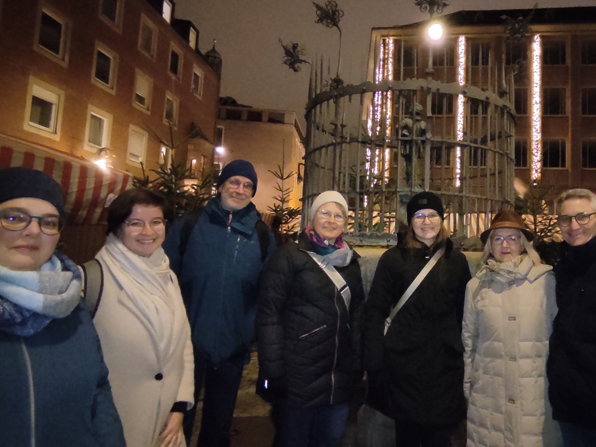 Nach der Lebküchnerführung durch das weihnachtliche Nürnberg fanden sich 9 Mitglieder und Interessenten beim Gänsemännchenbrunnen ein. Bei Glühwein ergaben sich nette Gespräche und neue Ideen fürs Jahr 2026, vor allem an Treffen vor Ort wurde großes Interesse bekundet. Eine Gelegenheit wird sich dazu am 28. Januar 2026 ergeben, zum 1. European Doc Dinner.