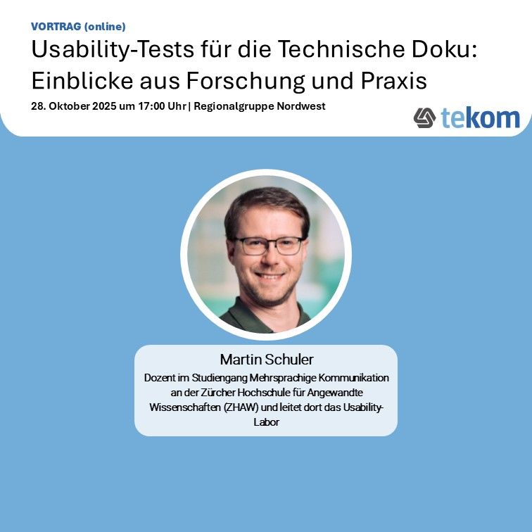 Rund 60 Teilnehmende verfolgten am 28. Oktober 2025 den Online-Vortrag der tekom-Regionalgruppe Nordwest zum Thema „Usability-Tests für die Technische Doku: Einblicke aus Forschung und Praxis“. Referent war Martin Schuler, Dozent im Studiengang Mehrsprachige Kommunikation an der Zürcher Hochschule für Angewandte Wissenschaften (ZHAW) und seit vielen Jahren Leiter des dortigen Usability-Labors.