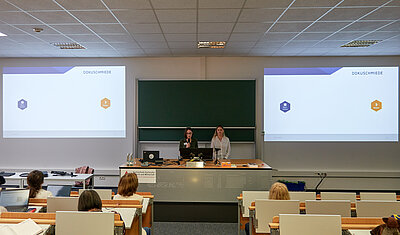| Vorstellung des Studiengangs Internationale Fachkommunikation - Sprache und Technik, Master, an der Universität Hildesheim | Franziska Heidrich-Wilhelms, Lehrkraft für besondere Aufgaben, Absolventin von dem o.g. Studiengang Damaris Bendin, MA-Studentin in dem o.g. Studiengang | |